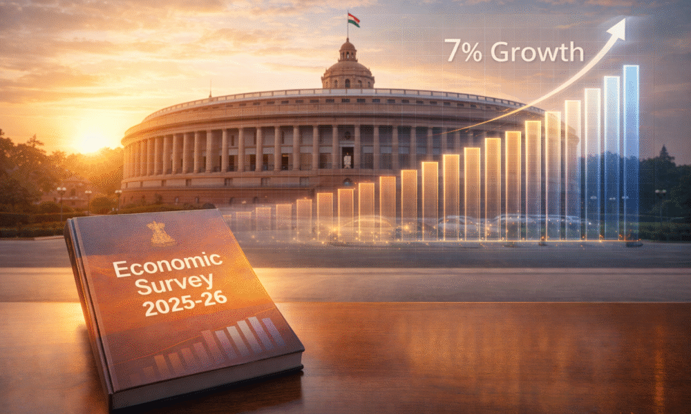 नई दिल्ली — वैश्विक पदानुक्रम में भारत की स्थिति को पुनर्कल्पित करने वाले एक ऐतिहासिक दस्तावेज के रूप में, केंद्रीय वित्त मंत्रालय ने गुरुवार को संसद में आर्थिक सर्वेक्षण 2025-26 पेश किया। मुख्य आर्थिक सलाहकार (CEA) वी. अनंत नागेश्वरन के नेतृत्व में तैयार यह सर्वेक्षण आगामी वित्तीय वर्ष (FY27) के लिए 6.8-7.2% की विकास दर का अनुमान लगाता है। हालांकि यह पूर्वानुमान अंतरराष्ट्रीय मुद्रा कोष (7.3%) और विश्व बैंक (7.2%) के अनुमानों की तुलना में थोड़ा रूढ़िवादी है, लेकिन यह भारत की मध्यम अवधि की विकास क्षमता में एक मौलिक बदलाव को रेखांकित करता है—जो अब ठोस 7% पर टिकी है।